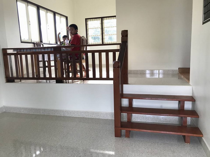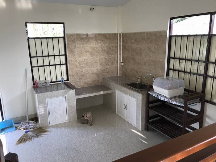 พื้นที่เล่นระดับชั้นล่างจัดเป็นมุมทำครัวเปิด ก่อเคาน์เตอร์ครัวรูปตัวแอลกรุแต่งด้วยกระเบื้องลายหิน ผนังกันเปื้อนกรุแต่งด้วยกระเบื้องสีน้ำตาลเพื่อให้ง่ายต่อการเช็ดทำความสะอาด พร้อมทั้งมีหน้าต่างช่วยเปิดระบายกลิ่นและควันระหว่างการทำอาหาร