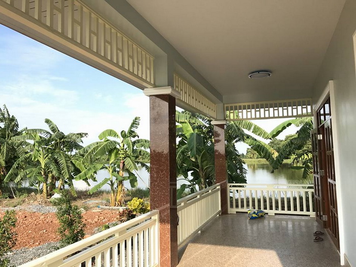 เฉลียงแนวยาวเพิ่มดีเทลด้วยระแนงไม้สีขาว ล้อมรอบด้วยโทนสีเดียวกัน พื้นปูกระเบื้องลายหินเพื่อความสะดวกในการทำความสะอาด สามารถจัดวางเก้าอี้ไว้เป็นมุมนั่งเล่นพักผ่อนชิลล์ๆ นอกบ้านได้