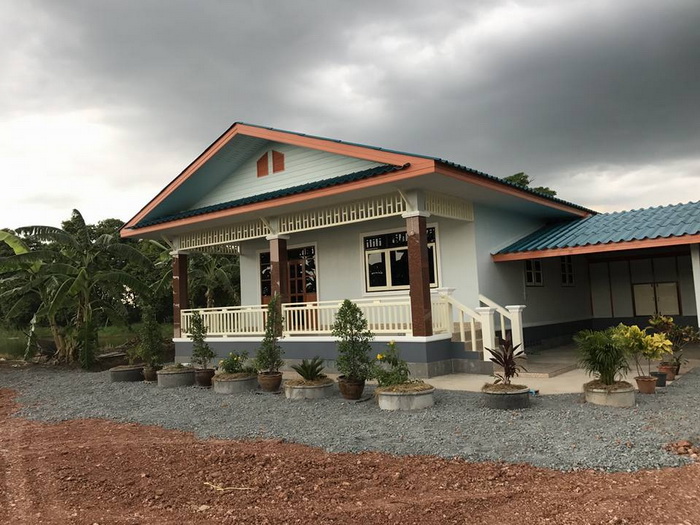 บ้านหลังนี้คงเป็นผลงานการก่อสร้างจาก ช่างติ๊ด ที่ได้รับเหมาก่อสร้าง ดีไซน์เข้ากับบ้านสวนชั้นเดียวยกพื้นสูง การออกแบบตกแต่งเน้นไปทางความเรียบง่าย โครงสร้างก่ออิฐฉาบปูนแต่งแต้มด้วยโทนสีฟ้าสบายตา ลงตัวไปกับหลังคามุงกระเบื้องเป็นลอนสีฟ้าทรงจั่ว พืื้นที่โดยรอบบ้านโปร่งโล่งมีมุมพักผ่อนรับลมจากธรรมชาติทั้งตรงเฉลียงและติดตัวโรงรถต่อเติม